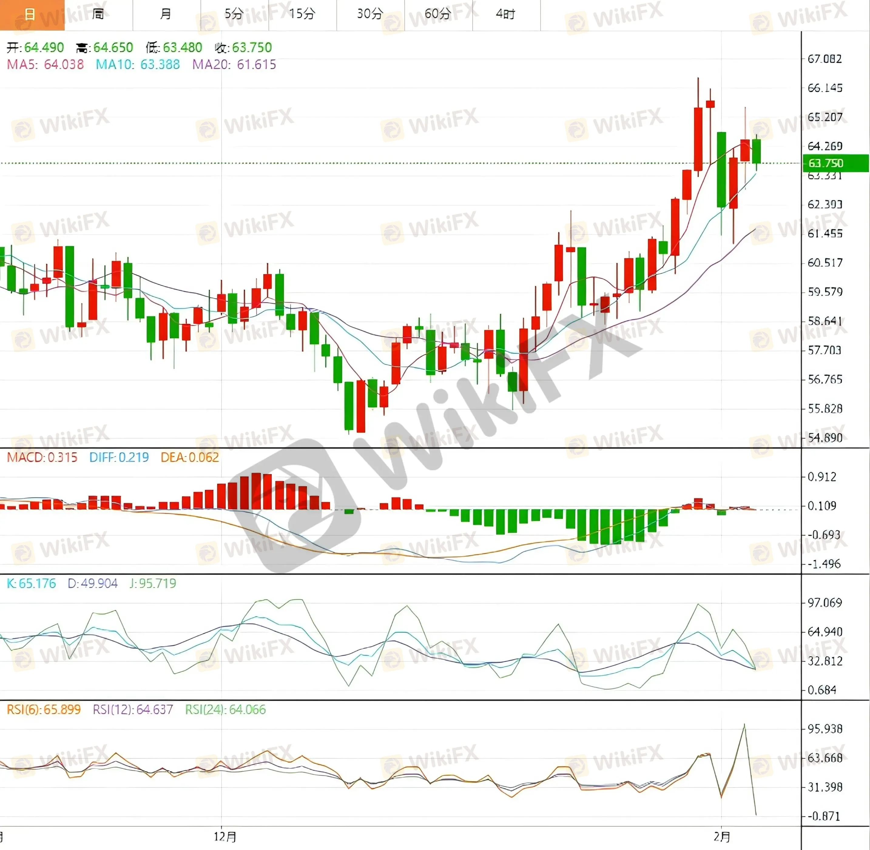 从日线结构来看,WTI 原油仍运行在中期上行通道之中,但走势已由此前的趋势推动阶段转向高位消化阶段。价格在接近阶段性高点后未能持续放量上攻,日线实体逐步收窄,反映出多空双方在高位区域的博弈明显加剧。均线系统方面,短期均线仍位于中期均线之上,整体多头排列尚未遭到破坏,这表明中期趋势基础依然存在。但短期均线的上行斜率已明显放缓,显示市场追涨动能正在降温。