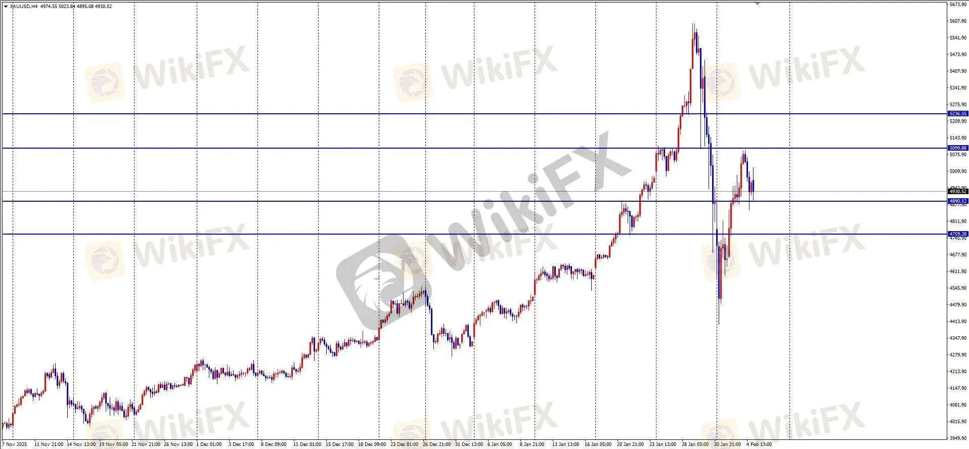 摘要:XAU/USD昨日回顾与 ETO Markets 观点周三,黄金在亚盘突破小幅震荡区间上行,于 5100 附近受阻后,于美盘加速下行至 4855 附近企稳,全日波动约 2373 点,日线收类十字星。自高位回落后,反弹已接近黄金分割 61.8% 阻力位。早盘跳空高开快速下跌,目前已跌破昨日低点,4 小时 MACD 于 0 轴上方死叉,行情有望进一步下探。下方首要支撑关注 4700 - 4650 区域