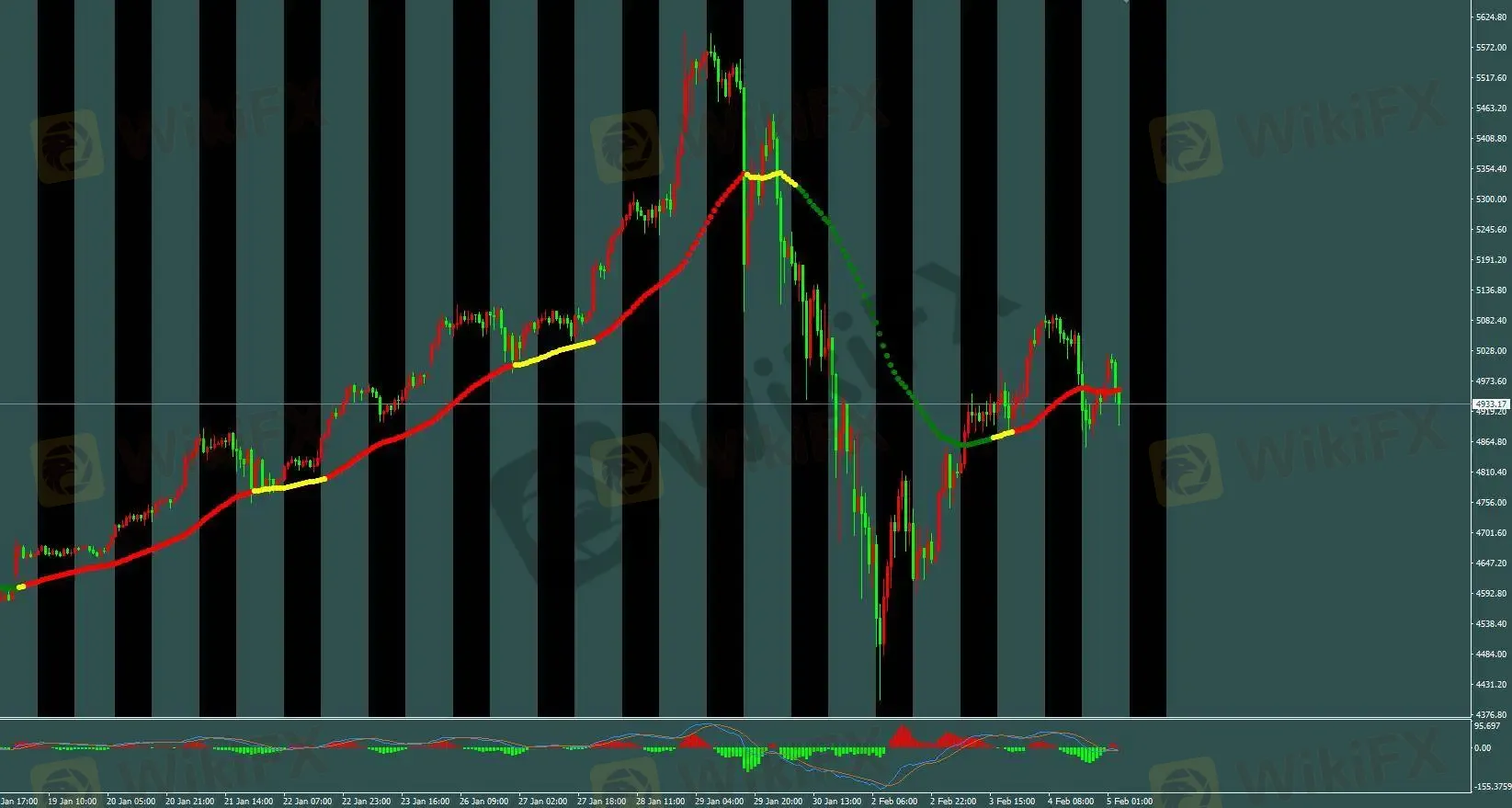 三色线颜色维持红色,H1 标准多单已于 4965 入场并盈利 200 点出场。日内可结合 M5 基础模型进行短线操作。