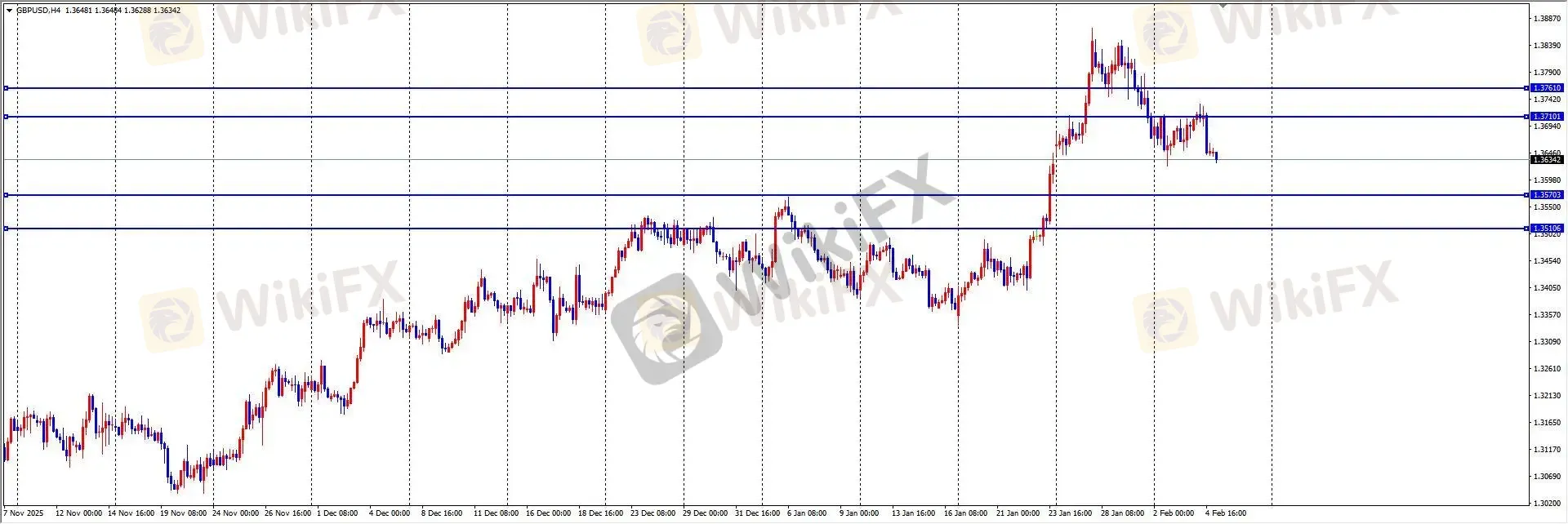 周三英国服务业 PMI 升至 54.0,为 2025 年 8 月以来最高。美国 ADP 就业数据不及预期。镑美上涨至 1.3733 后回落至 1.3642 整理,全日波幅约 88 点,日线收上影阴线。后市关注英国政策动向。