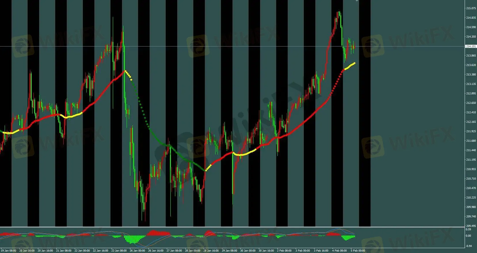 三色线颜色维持红色,H1 标准多单已于 211.35 入场并盈利 70 点出场。日内建议依据 M5 基础模型操作。