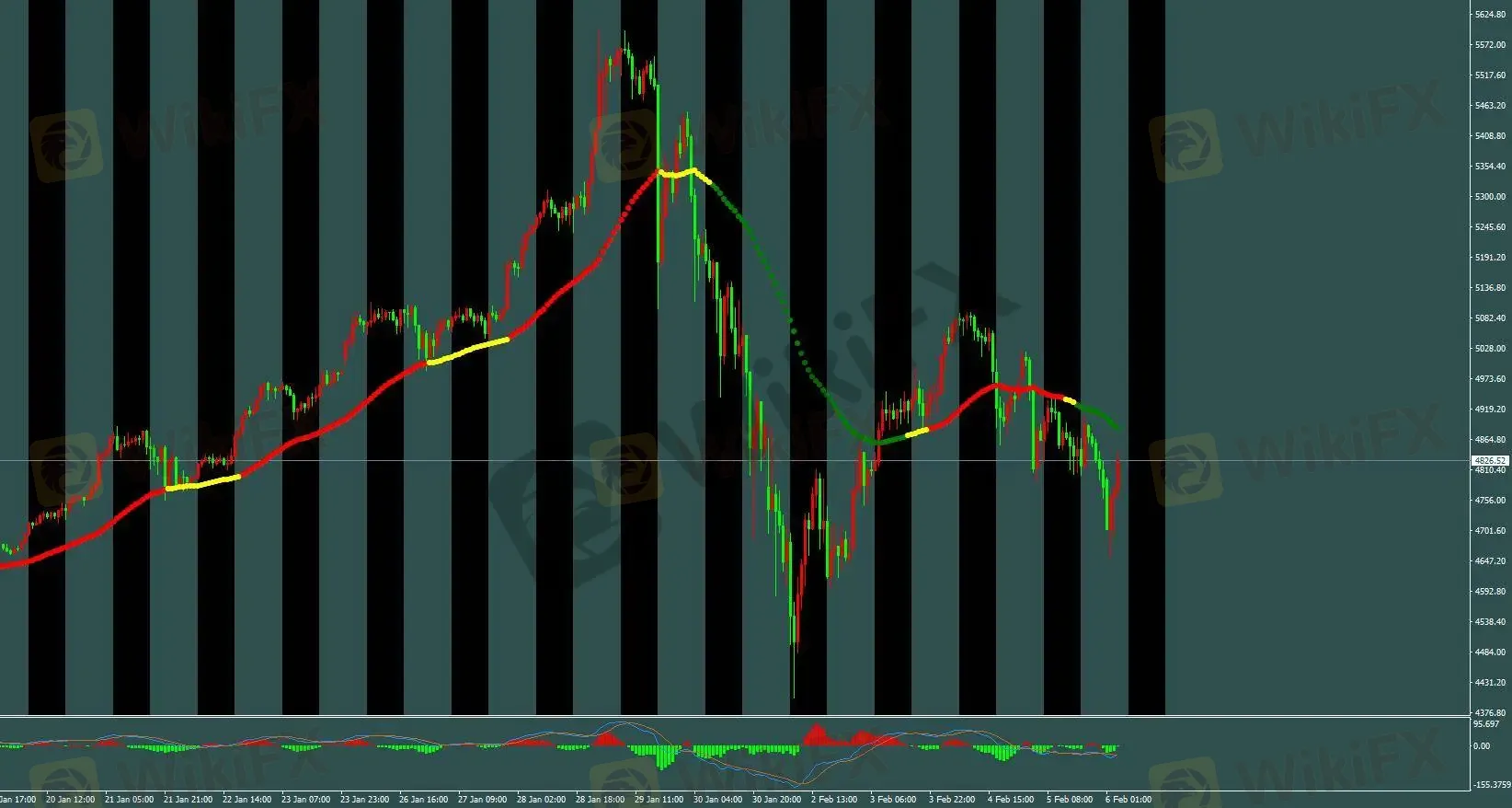 当前 H1 周期三色线已由黄转绿,前期于 4965 附近入场的标准多单已盈利 200 点离场。今日日内交易可结合 M5 基础运用模型寻找短线机会。