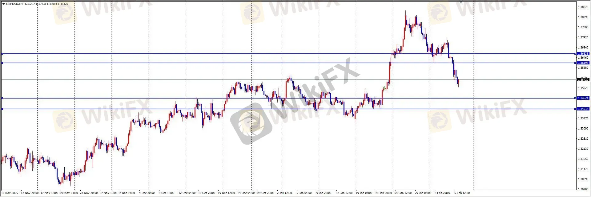 英国央行维持利率不变,但会议纪要及投票结果意外偏鸽,有四位委员支持降息,导致市场情绪迅速转向。美元则因基本面稳固获得支撑。镑美承压下行至 1.3517 附近整理,全天波幅约 136 点,日线收带上下影线的阴线。