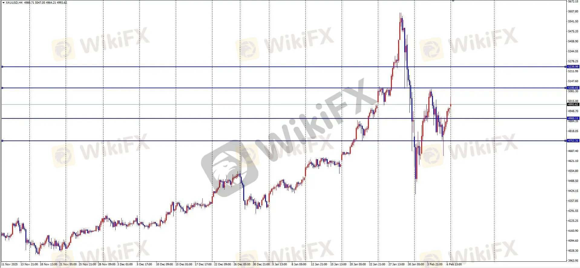 摘要:XAU/USD昨日回顾与ETO Markets观点上周五黄金亚盘跳空高开,随后加速下行并跌破前一交易日低点至4650附近,企稳后一路震荡上行,美盘时段最高触及4973,全天波幅约3162点。日线收带下影阳线,周线收线下影偏长。ETO Markets分析认为,周线与日线形态显示本周仍有上行可能,但5100一线存在强阻力,若无法突破,行情或转入宽幅震荡。今日早盘跳空高开冲高至5047后回落,4小时连续