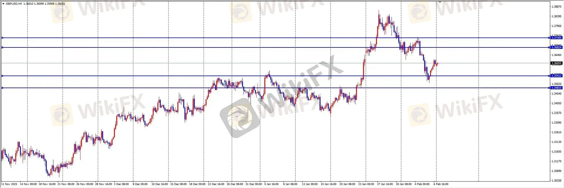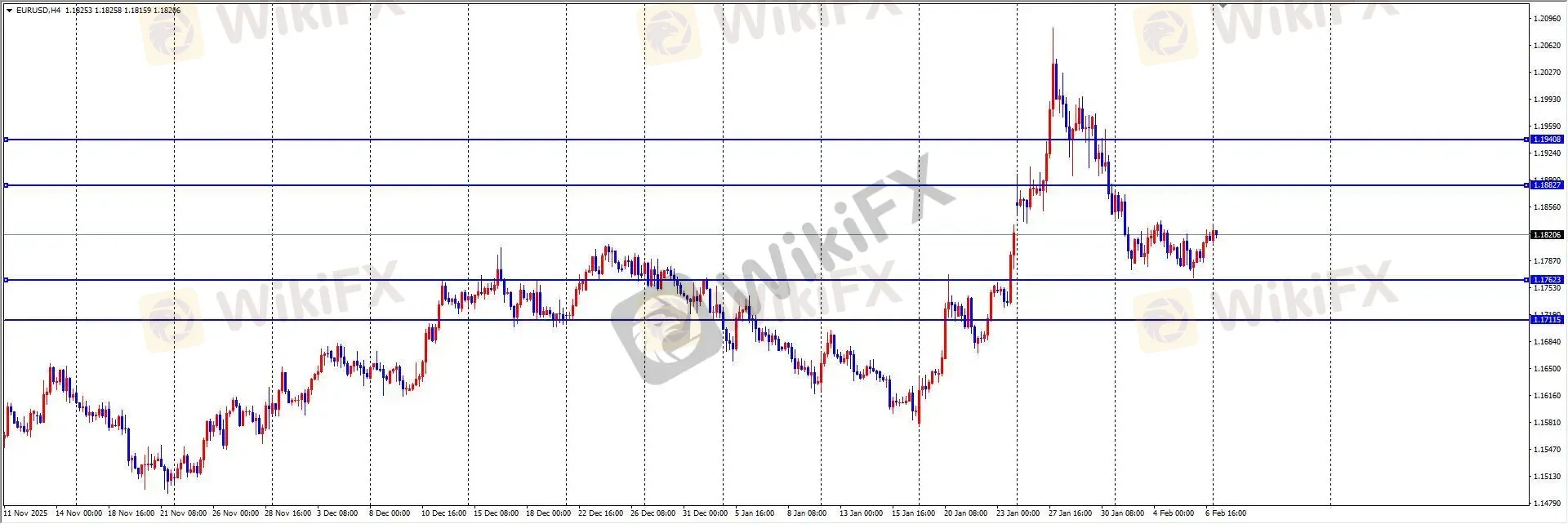 上周五欧元兑美元整体维持震荡,最高触及1.1826后整理,全日波幅约60点,日线收出上下影阳线。ETO Markets指出,德国12月工业产出数据不及预期,而美国消费者信心与通胀预期有所改善,基本面对欧元支撑有限。后市需关注欧洲政策动向对市场的影响。