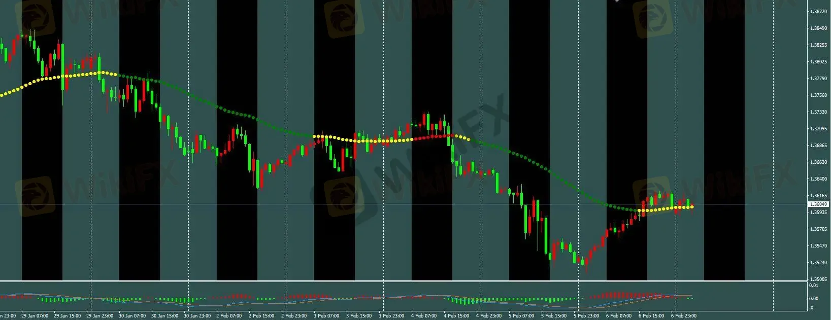 H1趋势线由绿色转为黄色,已按模型在1.3954附近介入空单。保护止损设于1.367上方,止盈目标为开仓价下方60点,趋势线转红即平仓。
