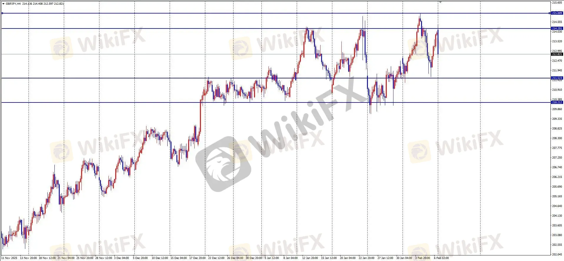 上周五镑日亚盘快速下探至211.6后企稳反弹,美盘继续拉升至214附近,全天波幅约245点,日线收出下影较长的大阳线。ETO Markets分析指出,早盘跳空高开至214.4后快速回落,1小时MACD于0轴上方形成死叉,短线有回调压力,下方关注212.6及212支撑,整体仍处于宽幅区间内,建议支撑位附近布局多单。