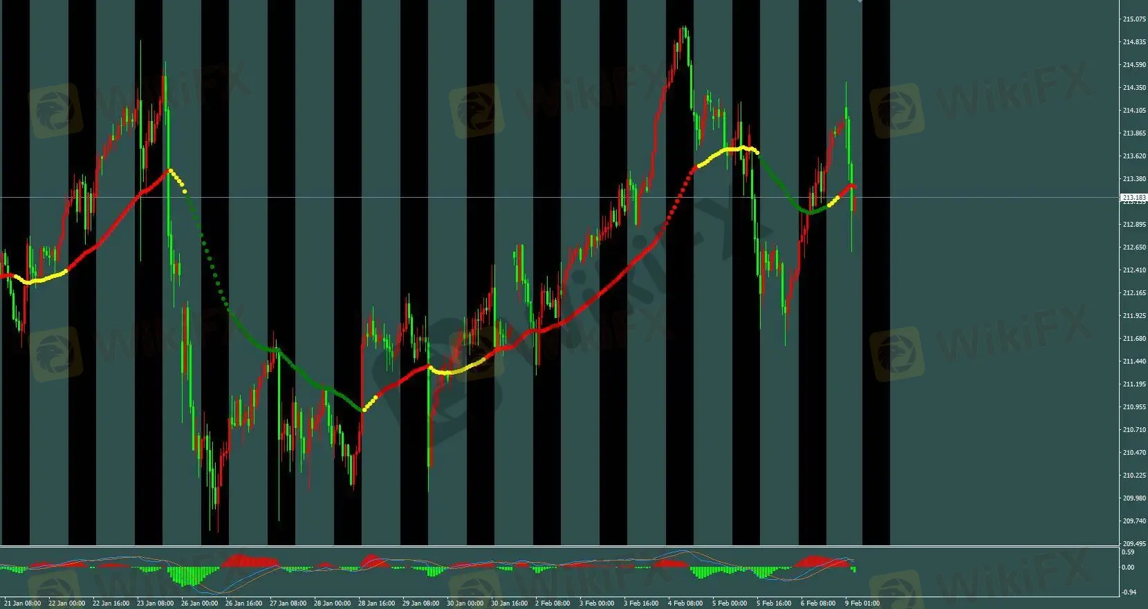 三色线由黄转红,H1标准空单已平仓,多单已于213.3进场,止盈70点,保护止损设于开仓价下方120点或三色线转绿即平仓。日内可结合M5基础模型进行短线操作。