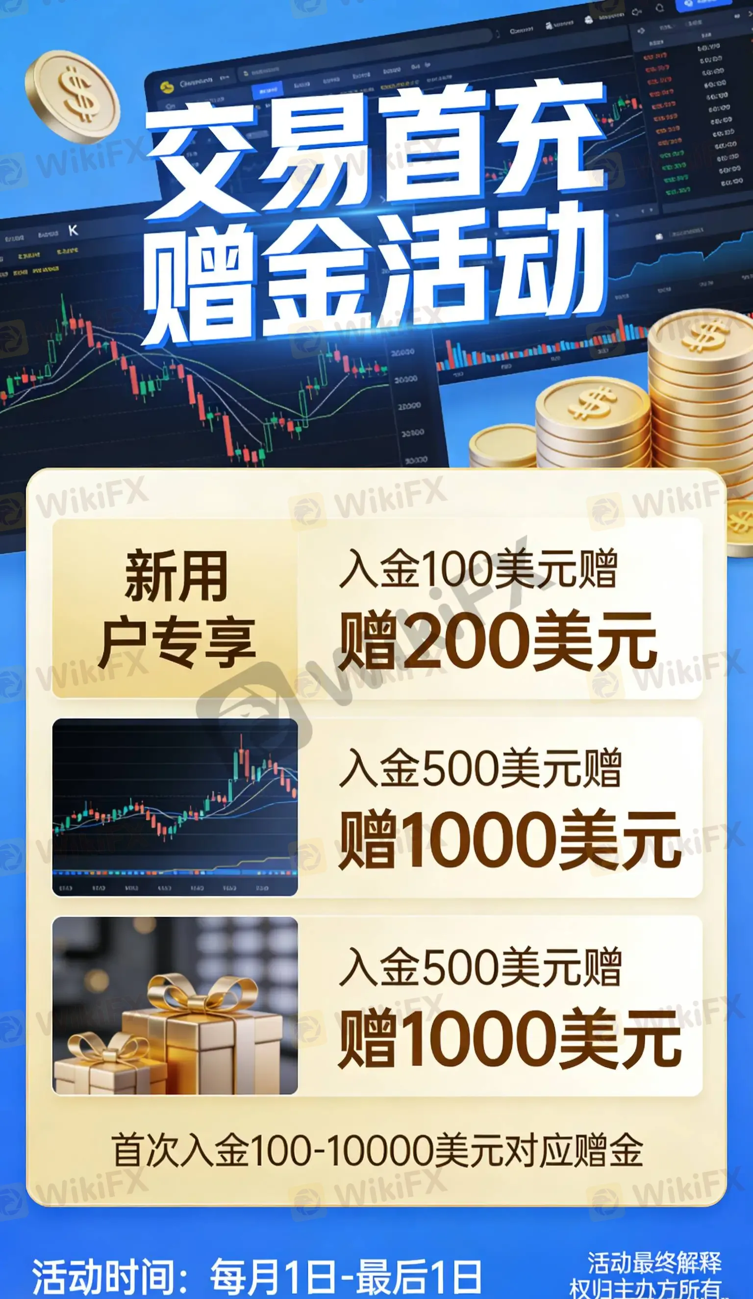 新客专属|每月持续狂欢!入金最高赠20000美元,交易再享多重返利✨