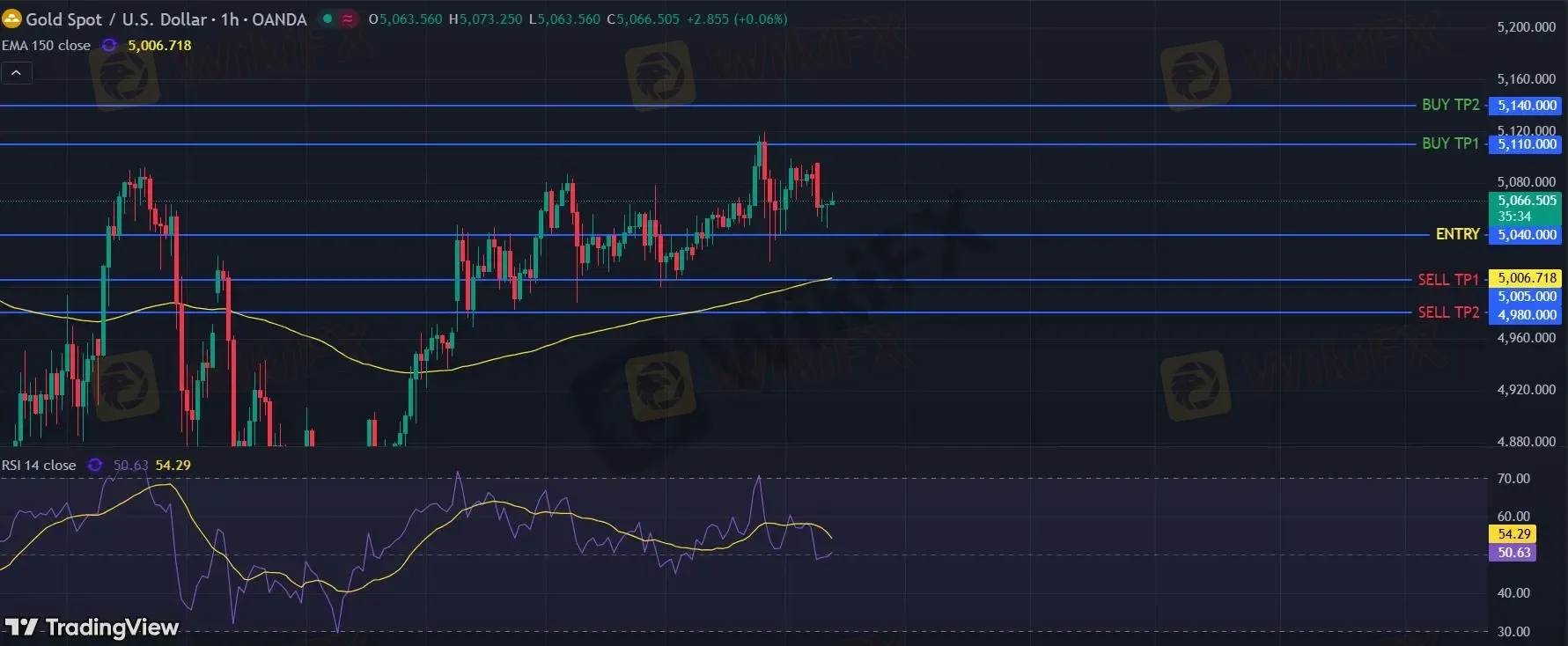 黄金现货 当日内: 在5040之上,看涨。
