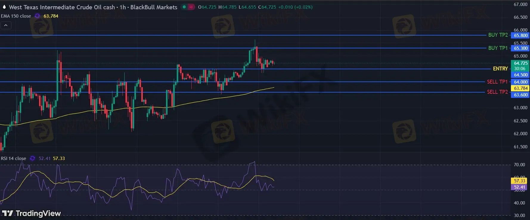 在 64.50 下,看空,目标价位定在 64.00 ,然后为 63.60。