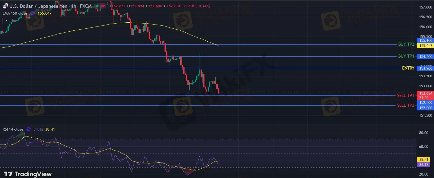 在 153.90 之下,看跌,目标价位为 152.50 ,然后为 152.00 。