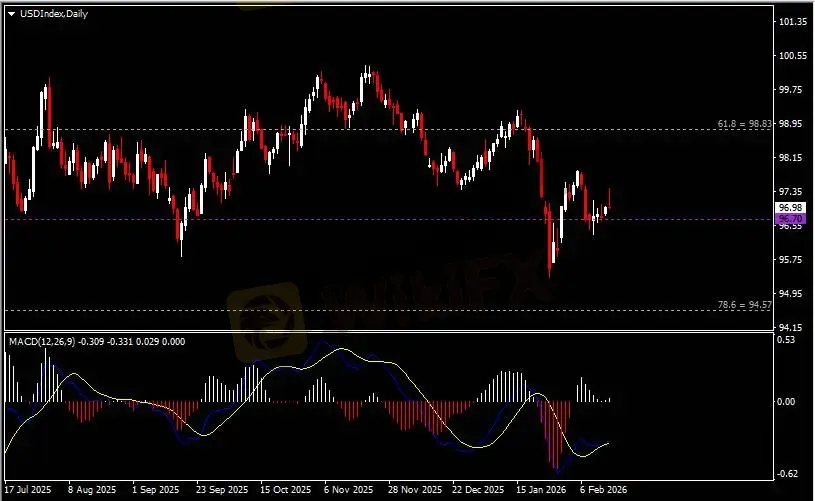 日线图显示美元指数先涨后跌,当前仍收于96.70支撑。从MACD来看,快慢线向上运行,白色动能柱恢复增量。指数走势和动能柱的变化呈分歧。
