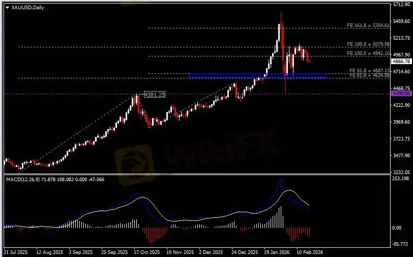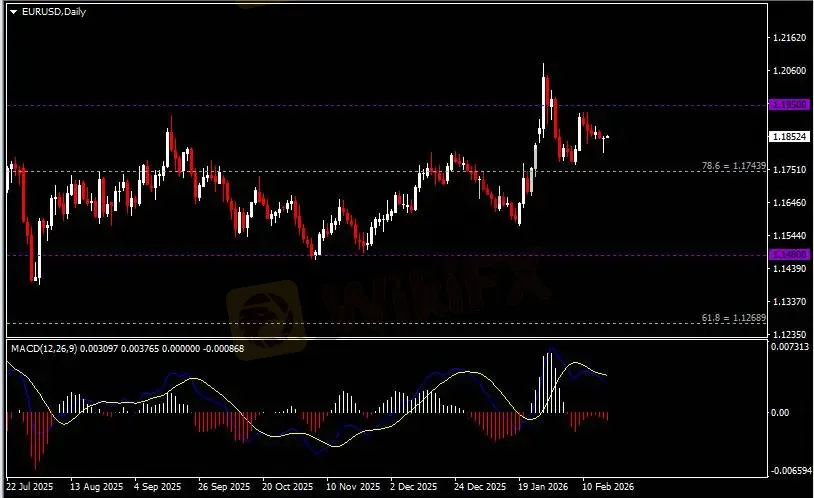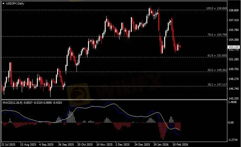 日线图显示美元兑日元小幅回落,当前承压于154.80阻力。从MACD来看,快慢线向下扩张,红色动能柱则温和收缩。汇价走势和动能柱的变化稍显分歧。