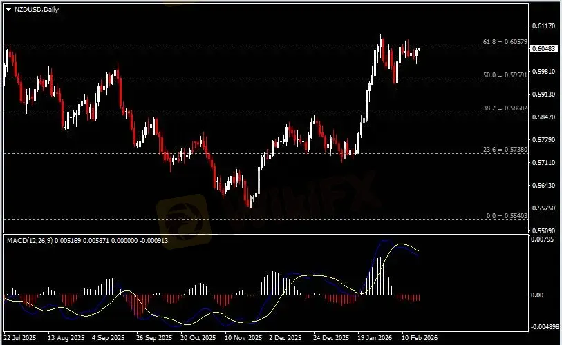 日线图显示纽元兑美元反弹上行,当前逼近0.6060阻力。从MACD来看,快慢线向下运行,红色动能柱则呈平行。汇价走势基本和动能柱的变化一致。