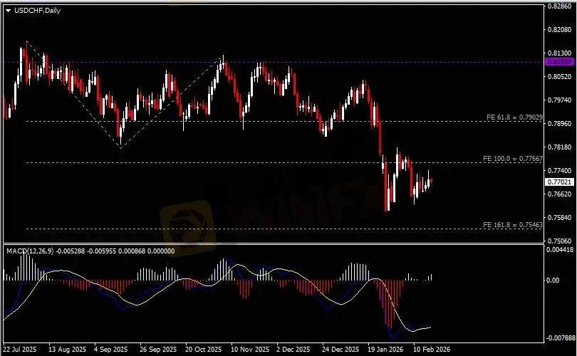 日线图显示美元兑瑞郎反弹上行,当前仍承压于0.7770阻力。从MACD来看,快慢线向上运行,白色动能柱温和增量。汇价走势基本和动能柱的变化一致。