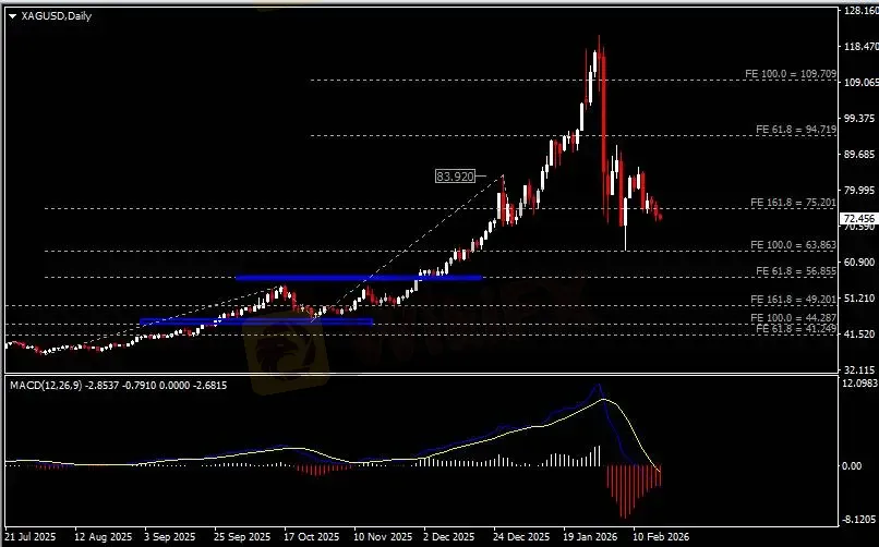 日线图显示银价震荡下跌,当前收于前低75.20。从MACD来看,快慢线向下运行,红色动能柱则温和收缩。银价走势和动能柱的变化呈分歧。