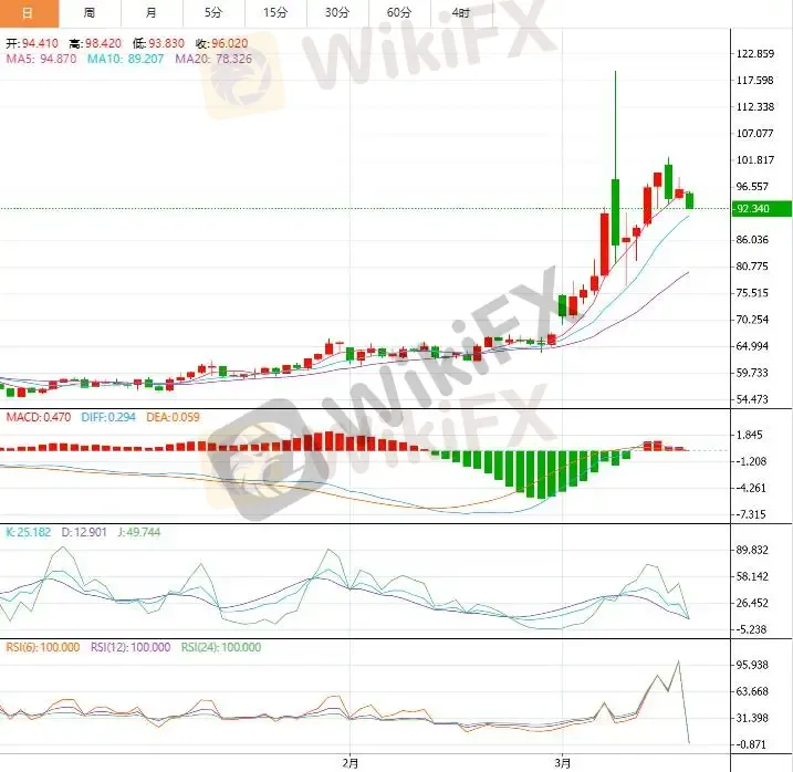从技术图表观察,WTI日线级别虽仍维持上升趋势,但上涨斜率已明显放缓,高位反复震荡显示多空分歧加剧。当前90美元构成关键短期支撑,97至100美元则是上方重要阻力区域。4小时周期上,价格呈现“震荡重心上移”但上涨动能递减的态势,多次在95美元附近受阻回落,表明上方抛压正逐步增强。一旦有效跌破92美元支撑位,则可能触发技术性回调。