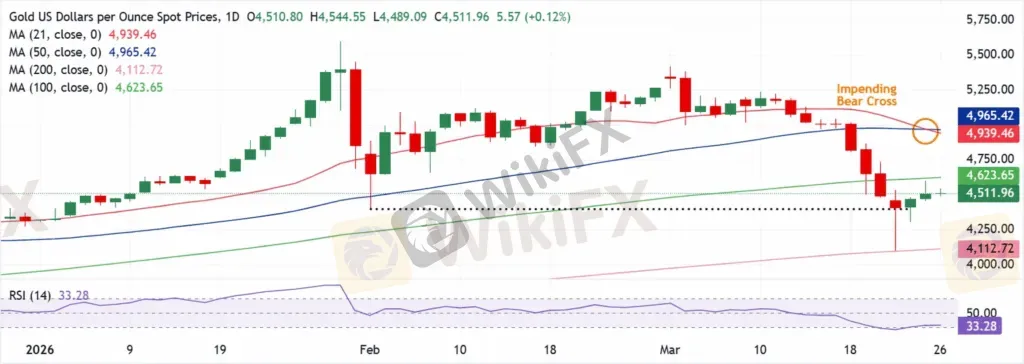 摘要:周四早盘,黄金在$4,500附近维持守势,一天前,黄金在$4,600附近遭遇阻力。中东停火希望破灭,局势升级风险隐现,美元维持近期强势。黄金似乎很脆弱,因为日线 RSI 仍低于 50,而且熊市交叉正在发挥作用。黄金结束了连续两日的反弹走势,周四早盘在$4,500附近转为守势,未能维持在$4,600关口上方。显然,潜在停火谈判的不确定性和混乱以及中东战争进一步升级的可能性,似乎使风险资金重新流入金融