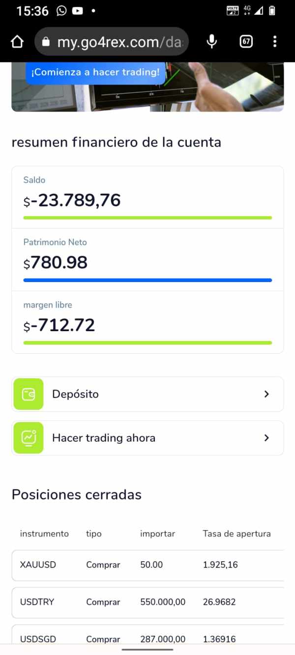 Expongo el caso de mi madre, una mujer de 65 años jubilada, GO4REX llegó a su vida a través de un anuncio publicitario en Facebook, a través de este anuncio se reprodujeron videos publicitarios con "testimonios" de gente que ganó dinero con esta plataforma. Posterior a esto se le realizaron llamadas de supuestos asesores persuadiendola a invertir con ellos, se le indicó que únicamente debería depositar $500 dólares y se le duplicarían sus ganancias, posteriormente, ella accedió y facilitó datos de su tarjeta de crédito a través de una llamada, progresivamente realizaban cobros acumulando un total de $3000 debitados de su tarjeta de crédito. Acaba de contarme lo sucedido y recurro a ustedes solicitando asesoría, debido a que se niegan a tramitar el retiro de dinero aduciendo "no cumplir con el volumen de operaciones requeridas", además se le han hecho débitos del capital invertido a razón de "Tarifa de inactividad". Adjunto evidencias a continuación.