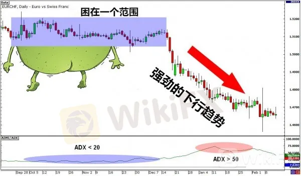 和第一個例子一樣,ADX指標在相當長一段時間維持在20一線下方。在這段時間,歐元/瑞郎也維持在區間以內波動。隨後,ADX指標上行突破50水平,而歐元/瑞郎則上破區間頂部阻力。
