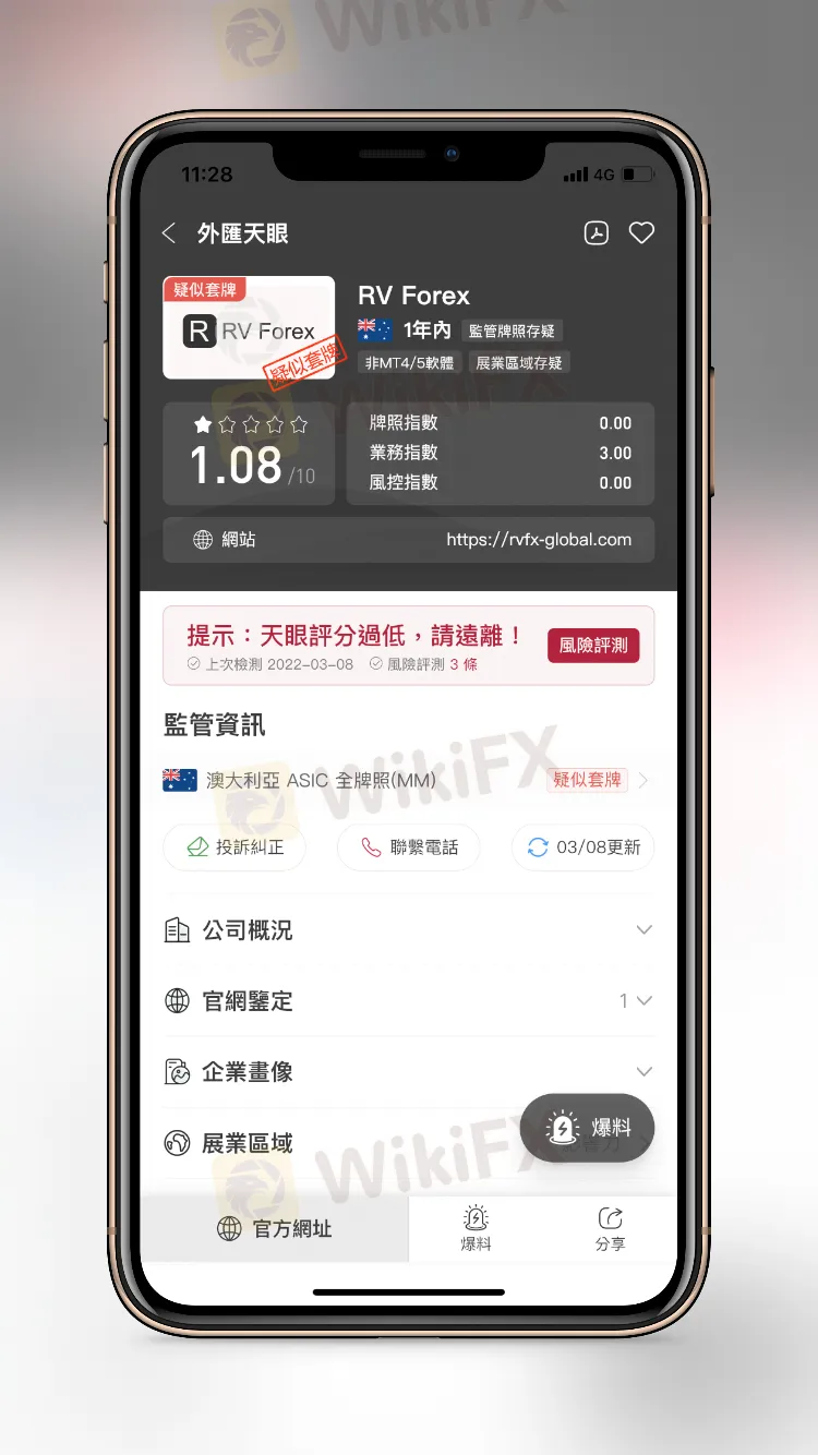 RV FOREX,其宣稱持有的澳大利亞ASIC授權的全牌照疑似套牌,從“監管中”變為“已撤銷”。