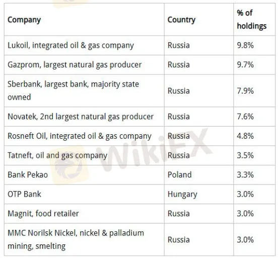 該基金前幾大重倉股皆為俄羅斯的原油股、天然氣股、銀行股等,包括全球最大的石油和天然氣垂直綜合公司之一的盧克公司(9.8%)、全球最大天然氣開採企業俄羅斯天然氣工業股份公司(9.7%)、東歐地區最大的商業銀行俄羅斯聯邦儲蓄銀行(7.9%)等等。