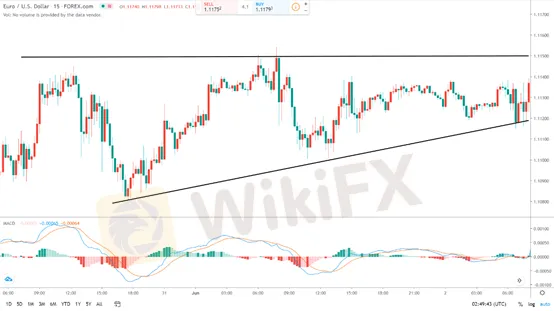 上圖清晰的展示了15分鐘歐美的走勢在4小時圖所處的階段,在更大的時間框架之下,我們非常清晰地發現了震盪上行的趨勢。有了更大周期的K線圖輔助之後,我們明白了,即便是以15分鐘的周期做短線交易,做多是比做空更加安全的選擇。02. 識別有盈利空間的時間段識別有盈利空間的交易品種,或者可以說是識別某個交易品種有盈利空間的時間段,是短線盈利與否的重要一步。趨勢無非就是三種,震盪、上漲以及下跌。但細分的話,還可以分為窄幅震盪、寬幅震盪、單邊上漲、震盪上漲、單邊下跌以及震盪下跌。對於短線交易而言,沒有波動,就意味著沒有盈利空間,因此,即便是明顯的上漲或者下跌行情,我們依舊希望有更多的震盪來博取盈利。我們再以歐美15分鐘K線圖為例:
