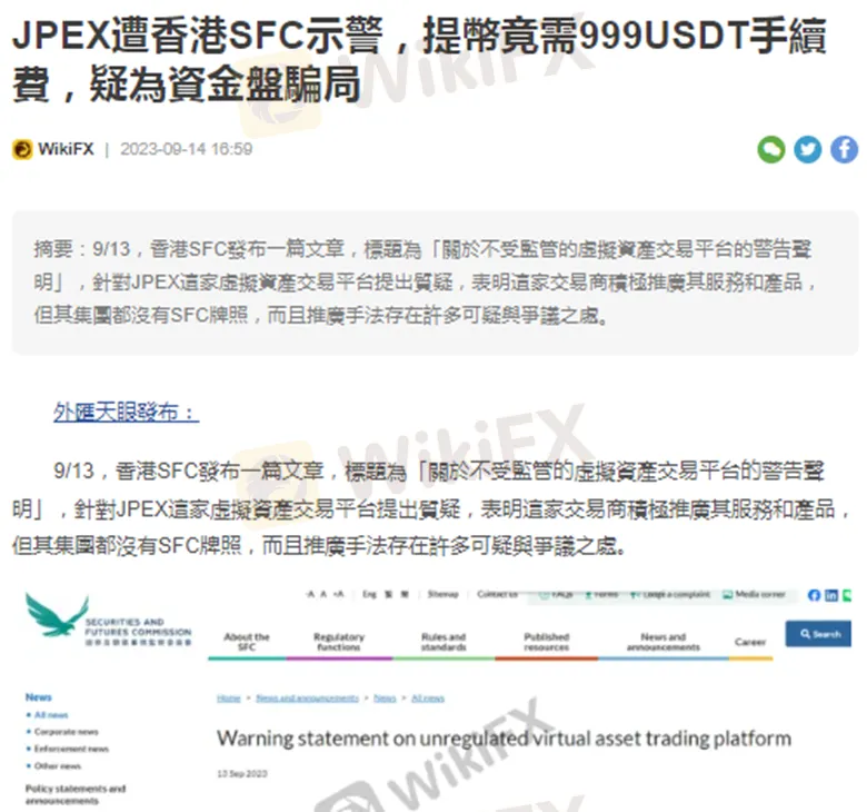 摘要:上週外匯天眼發布新聞「JPEX遭香港SFC示警,提幣竟需999USDT手續費,疑為資金盤騙局」,報導該平台被香港SFC質疑後調高提幣手續費、停止參展的怪異行徑,以及過去曾爆出資金爭議等黑歷史,有極大的資金盤疑慮。