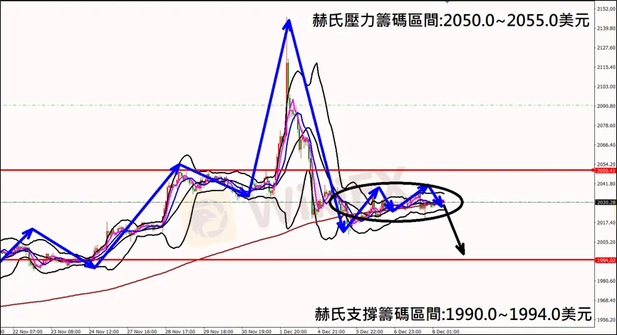 今日(12月8日)黃金早盤在2028.3美元/盎司附近,從技術分析面切入,1小時級別觀察黃金走勢昨日(7日)K棒持續落在低點區間震盪,目前K棒落在布林通道中軌附近,持續縮口型態,若是晚間數據利空同時跌破區間支撐後有望再次擴大跌勢,因此建議外匯市場投資人,今日黃金操作心態嘗試以偏空看法為主。
