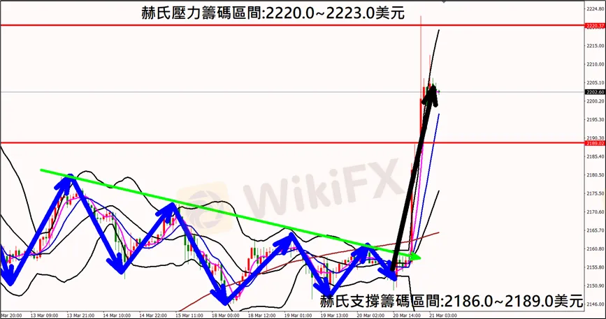 今日(3月21日)黃金早盤在2200.7美元/盎司附近,從技術分析面切入,1小時級別觀察黃金走勢昨日(20日)K棒有效突破下降壓力後大幅上漲,再創歷史新高價,目前K棒高點震盪,有望短線拉回後再次上漲,因此建議外匯市場投資人,今日黃金操作心態嘗試以偏多看法為主。