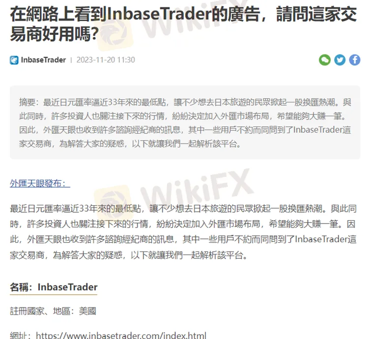 所有投資人請注意,外匯天眼2023年11月曾經發布回答用戶疑問的測評文章「在網路上看到InbaseTrader的廣告,請問這家交易商好用嗎?」列出該平台的監管情況、交易條件、平台環境,判定其整體評分不算高,不過也沒有收到相關爆料。