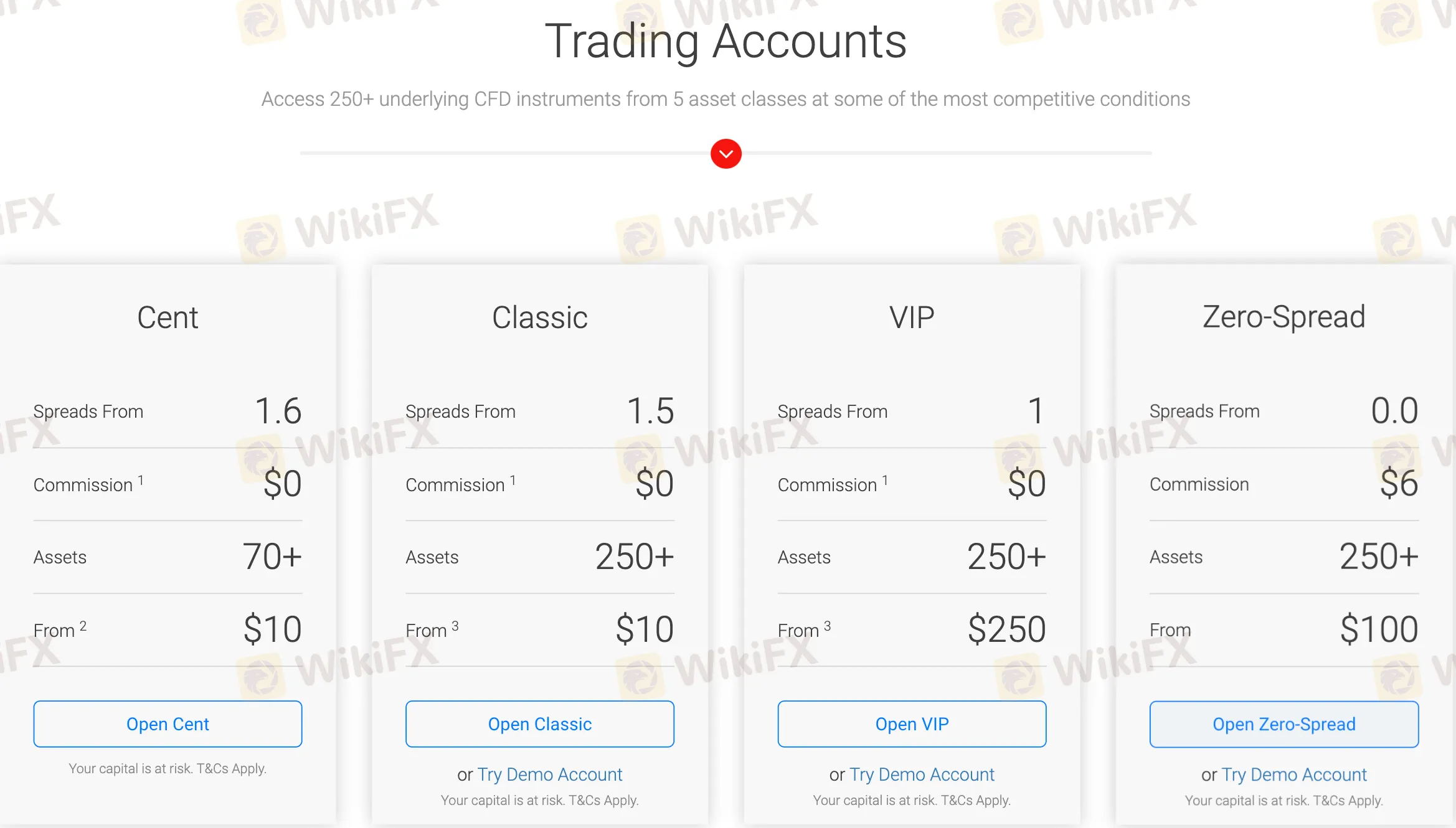 關於資產類別,Cent賬戶提供超過70種資產,而其他賬戶提供超過250種資產。