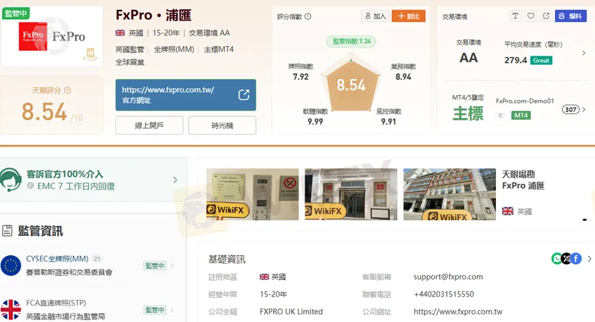 首先在安全性方面,透過外匯天眼官網可以查到這是成立15-20年、在全球展業的外匯券商,使用主標MT4/MT5交易軟體,持有塞浦路斯CYSEC全牌照、英國FCA直通牌照,並且提供「客訴官方100%介入」服務,天眼評分高達8.54。