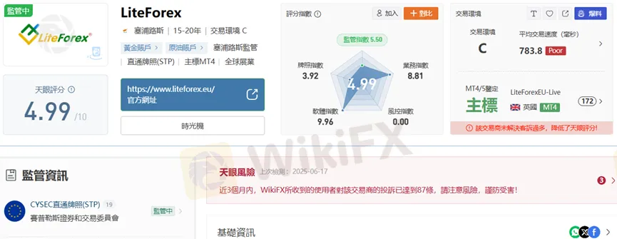 最近外匯天眼注意到,有不少用戶都在查詢LiteForex的評價。從外匯天眼官網收錄的資訊可知,這是一家成立15-20年、全球展業的交易商,使用主標MT4/MT5交易軟體,持有塞浦路斯CYSEC直通牌照,由於未解決客訴過多,天眼評分因此被拉低為4.99。
