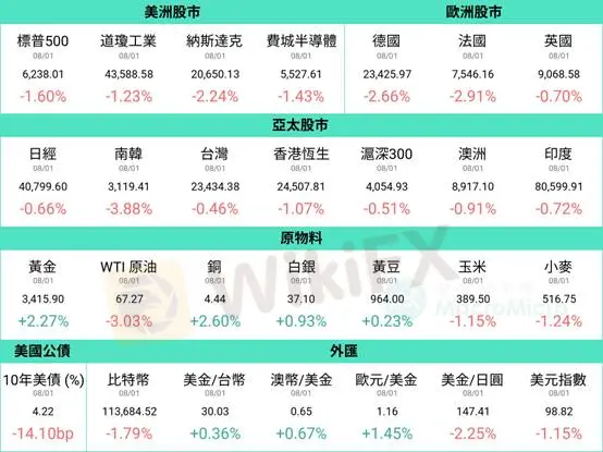 美國就業人口資料包告,反應著未來消費者終端強勁動能與否,本次非農就業人口新增就業人數為7.3萬人,大幅差於前值14萬新增就業與市場預期值,另外,大幅下修上月非農就業人口資料由14.7萬→1.4萬。引起美國公債價格大幅度上漲、股市重挫、美元指數暴跌、非美貨幣與黃金同步走升。