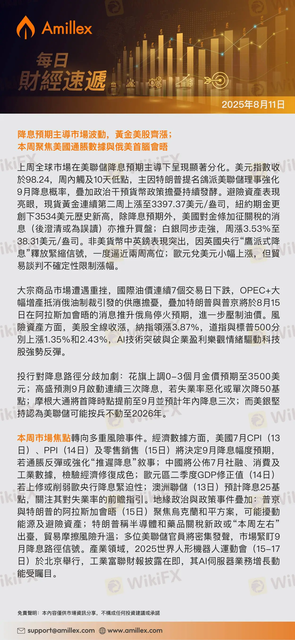 Amillex每日匯評:降息預期主導市場波動,黃金美股齊漲;本周聚焦美國通脹數據與俄美首腦會晤