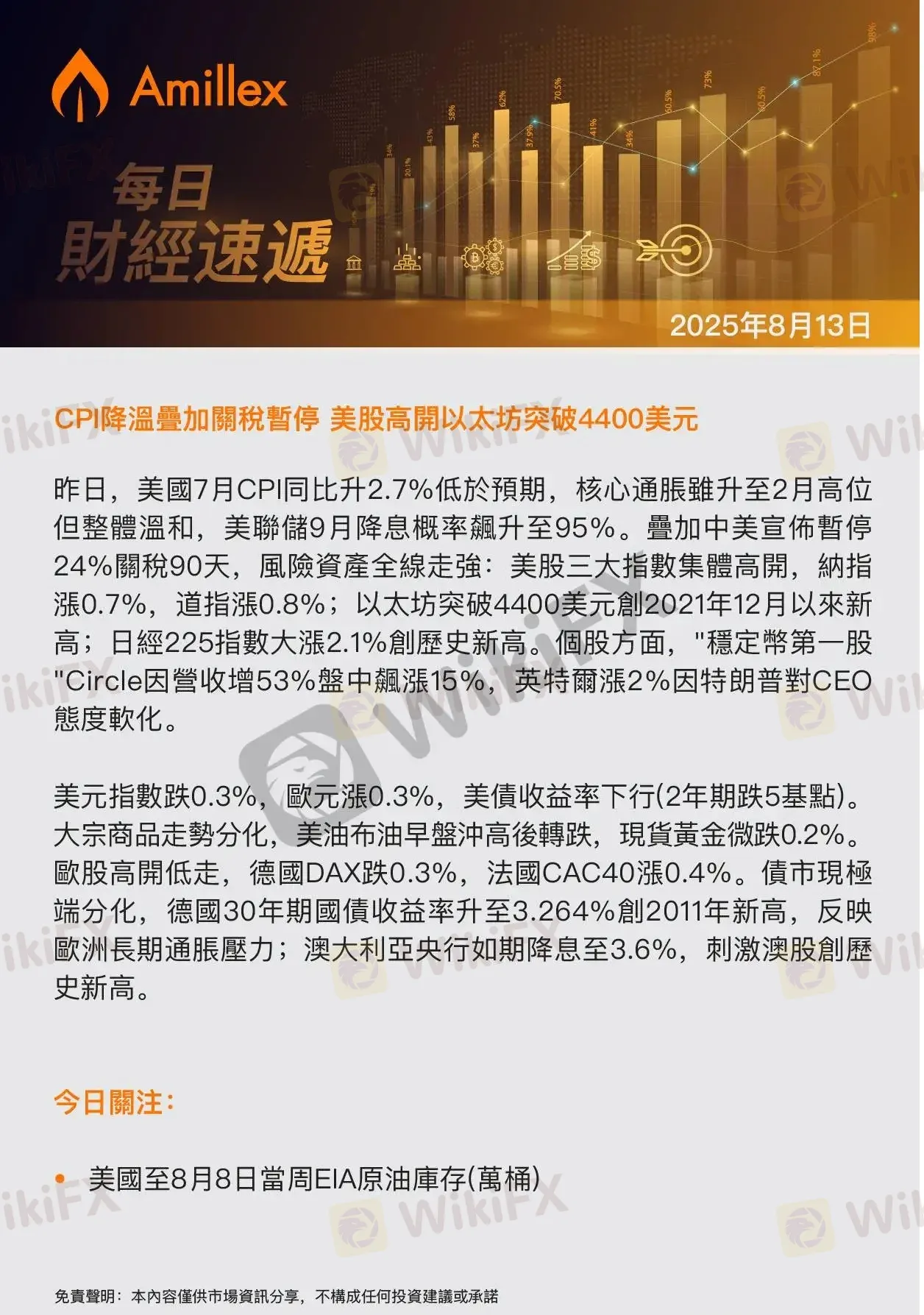 Amillex每日匯評:CPI降溫疊加關稅暫停 美股高開以太坊突破4400美元