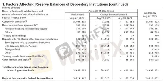 摘要:風險資產的飆漲行情炙熱與黃金短多強勢並行同進,市場沉溺在降息氛圍與AI利多的溫柔鄉。我們仍回顧總體經濟資料變化,以提供投資人交易前瞻指引。一、 流動性緩抽水趨勢未變觀察每週更新美聯儲資產負債表銀行存款準備金變化,雖然下降速度仍屬緩慢,但隨著隔夜逆回購(ONRRP)交易量持續收窄、美國財政部帳戶(TGA)資金水位不斷墊高,正說明當前市場流動性逐漸收窄。(圖一、美聯儲資產負債表;資料來源:FED)二、