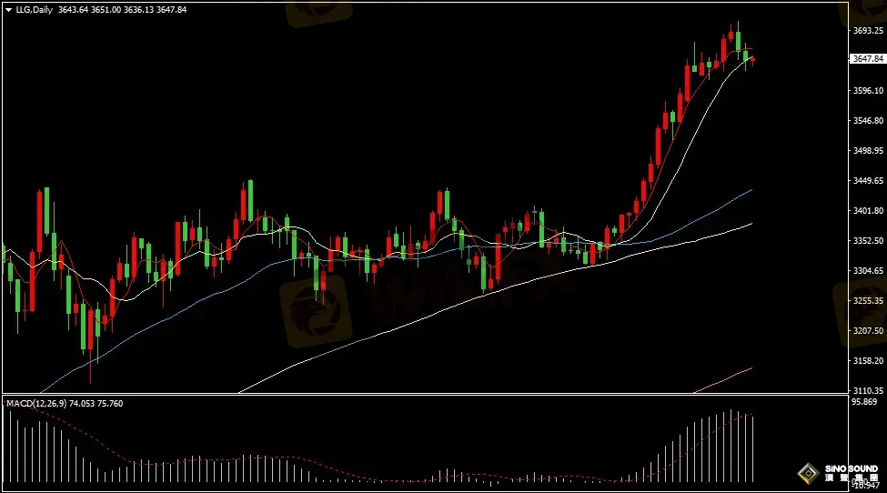金價日線圖看,美聯儲降息後金價連續二日回調整理,此前金價刷新歷史新高至3707美元,目前金價回落至3647美元附近運行。指標看,金價已經失守5日和10日均線,MACD指標正動能柱逐步減少,RSI指標回撤至69位置徘徊。