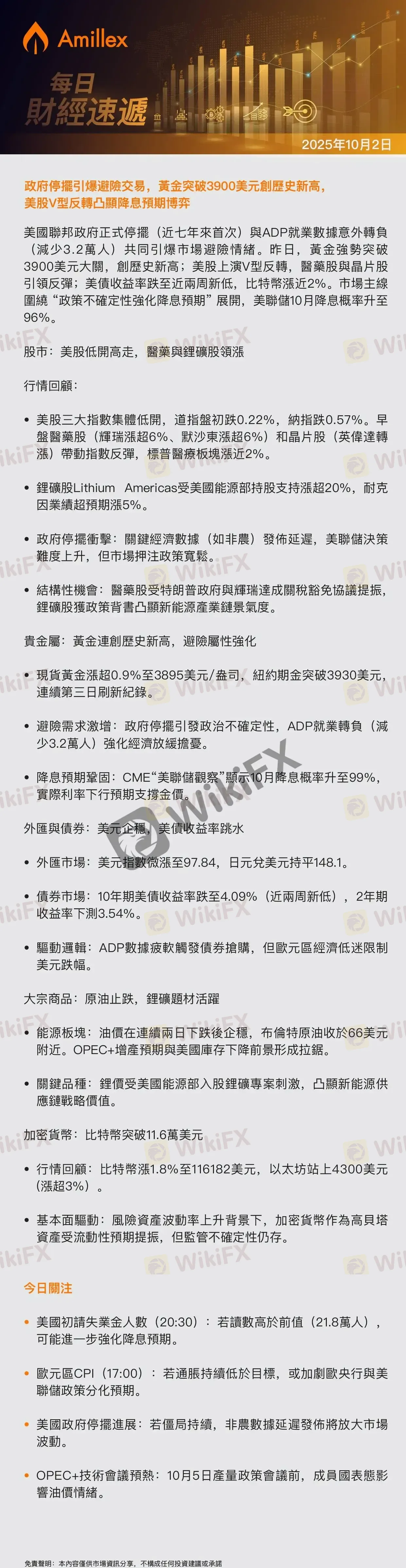 Amillex每日匯評:政府停擺引爆避險交易,黃金突破3900美元創歷史新高,美股V型反轉凸顯降息預期博弈