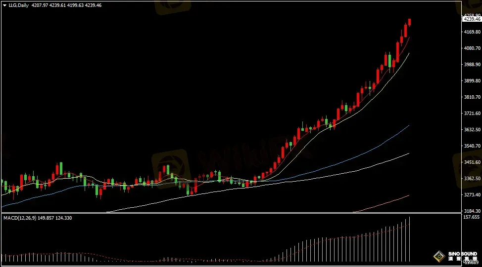 金價日線圖看,10月份以來金價持續強勁上漲,金價上漲逾400美元。今日金價再創歷史新高並逼近4240美元關口。日線指標看,金價在5日和10日均線保持多頭向上,MACD指標正動能柱持續增加,RSI指標上升至85位置附近運行。