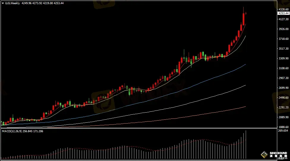 金價周線圖看,上周金價刷新歷史紀錄至4378.91美元/盎司,金價周線獲得連續9周上漲,這是自1970年以來第五次。同時,歷史經驗顯示,黃金從未成功實現10周連漲,上周五金價沖高後開始大幅回落調整,估計本周金價振盪整理為主。周線指標看,金價在5周均線上方逐步抬高,MACD指標正動能柱持續增加,RSI指標在超買線上方85位置附近走平。