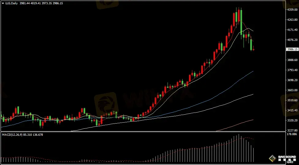 金價日線圖看,昨日金價大幅下滑並跌破4000美元關口,顯示金價近期調整仍然持續,5日與10日均線形成死叉後,短線空頭力量持續占優。日線指標看,MACD指標正動能柱持續減少,RSI指標回落至50位置附近徘徊。
