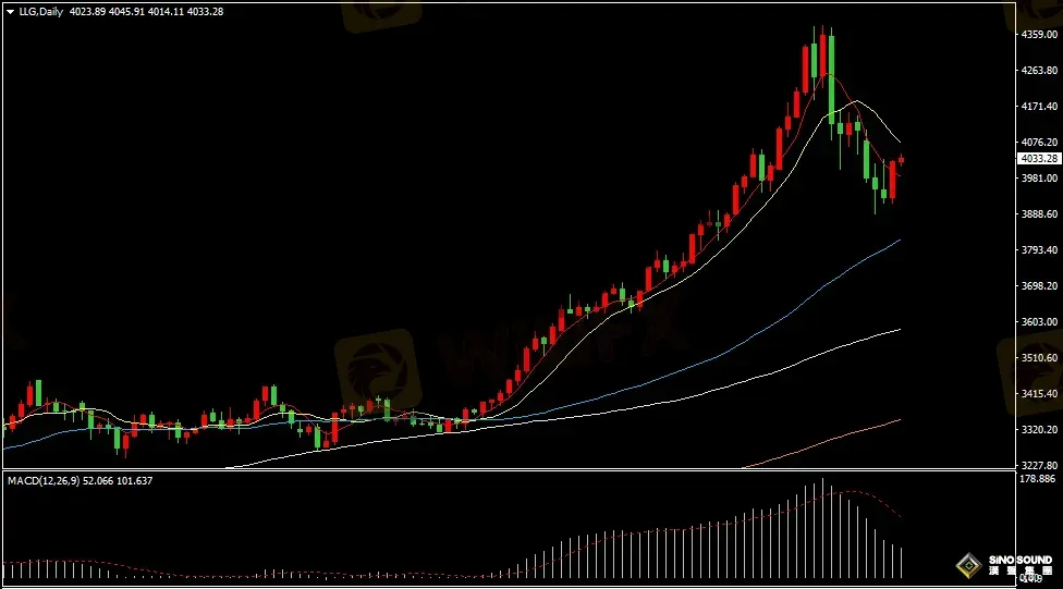 金價日線圖看,昨日金價止步三日連跌並錄得大漲2.39%,金價重新站上5日均線上方,金價下一個上攻目標將是10日均線(金價4072美元)。日線指標看,5日與10日維持空頭向下,MACD指標正動能柱持續減少,RSI指標回升至52位置附近運行。