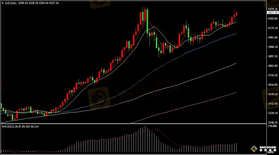 金價日線圖看,近日金價強勢上漲已經突破4300美元關口上方,金價逐步向歷史高點4381美元靠近,如金價能夠攻克上周五高點4353美元的阻力壓制,有望上攻4380美元附近。日線指標看,5日與10日均線形成多頭向上,MACD指標正動能柱再度增加,RSI指標突破超買線上方至71位置附近。
