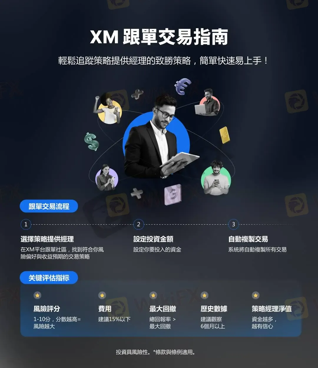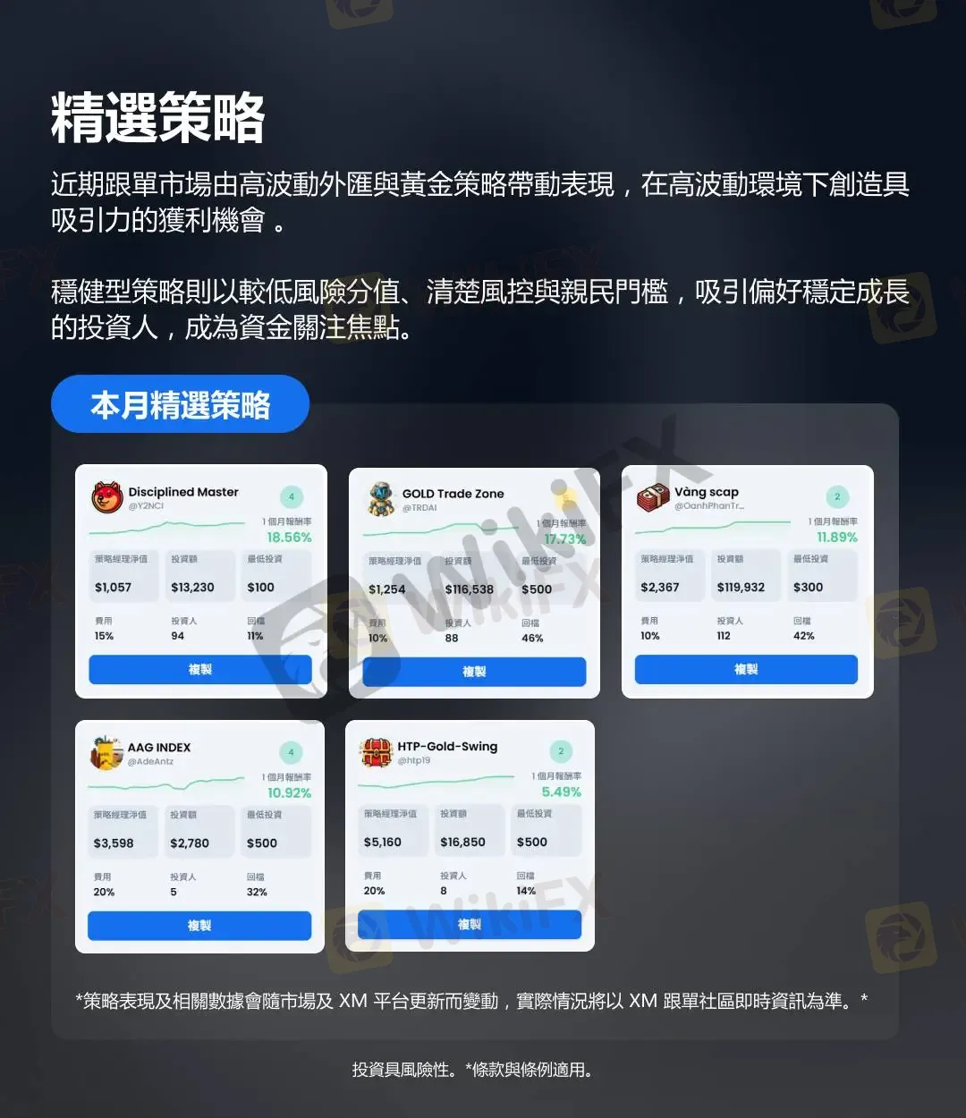 在 XM 跟單社區 (Copy Trading) 中,你可以依照個人風險偏好與交易風格,選擇合適的交易策略自動操作——輕鬆跟單,掌握市場節奏!